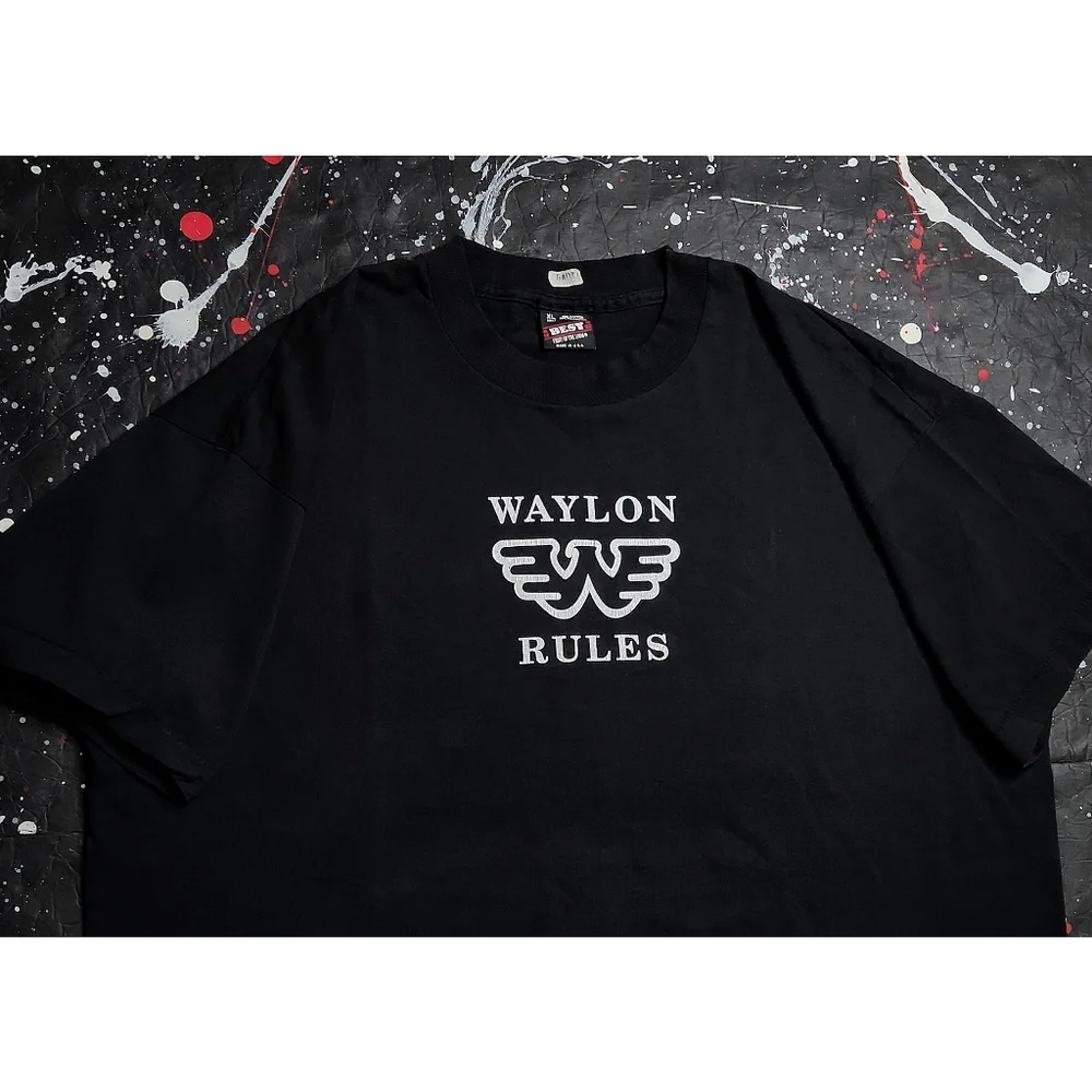 Good pre-owned vintage condition throwback 1990s men's exclusive short-sleeve , original-print Waylon Rules promotional concert series t-shirt, paying tribute to the late, legendary Waylon Jennings -- the singer, songwriter, musician, actor and Country Music Hall of Famer who pioneered the historic Outlaw Movement in the country and western genre ( alongside Willie Nelson , Johnny Cash , Kris Kristofferson & David Allan Coe ) -- and his 1994 live event tour performing on national television & across North America with two spell-out graphics on the front and back, plus the perfect amount of wear + character (optimal, tasteful fade across the fabric & sparse, natural signs of wear/fade spots) due to age (nearly 30 years old now), tailored to fans of a stylishly aged, well-worn true vintage aesthetic -- printed on a made in USA, old-school Fruit of the Loom merchandise tag (ULTRA RARE). This particular piece is incredibly rare, hardly ever available for purchase online : a perfect collector's item for Waylon, country & music fanatics alike.