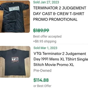 Very good vintage condition throwback 1990s ( dated 1990 ) T2 men's exclusive short-sleeve, original-print promotional sizzle t-shirt, paying homage to the legendary science-fiction action film Terminator 2: Judgment Day, directed by James Cameron -- which saw Arnold Schwarzenegger reprise his signature role as the Terminator, who was reprogrammed to protect the future leader of the human resistance John Connor and, in the process, save the future of humanity from a highly advanced killing machine sent back in time by Skynet -- with a glossy, metallic - style "T2" teaser graphic on the front + an iconic spell-out "He'll Be Back" hype lettering on the back, printed on an old-school Hanes Beefy-T merchandise tag (ULTRA RARE). This particular piece is extremely uncommon and was among the first initial designs manufactured prior to the US theatrical release on July 3, 1991, sharing many similarities to other special-edition cast & crew shirts sold online in recent years. Although this piece is in especially good shape for decades-old, true vintage merch, it does show some sparse, typical signs of natural wear/fade spots & fading in the fabric -- primarily along the seams -- due to age (nearly 35 years old now), as seen in photos.