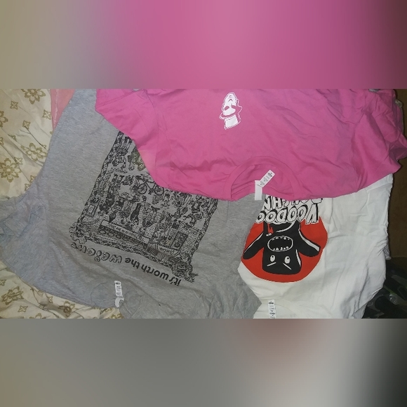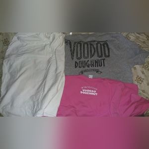 three Voodoo Donuts t-shirts pink one more a couple times. the gray is a large the pink and the white are extra large white one was never worn.