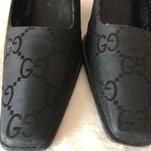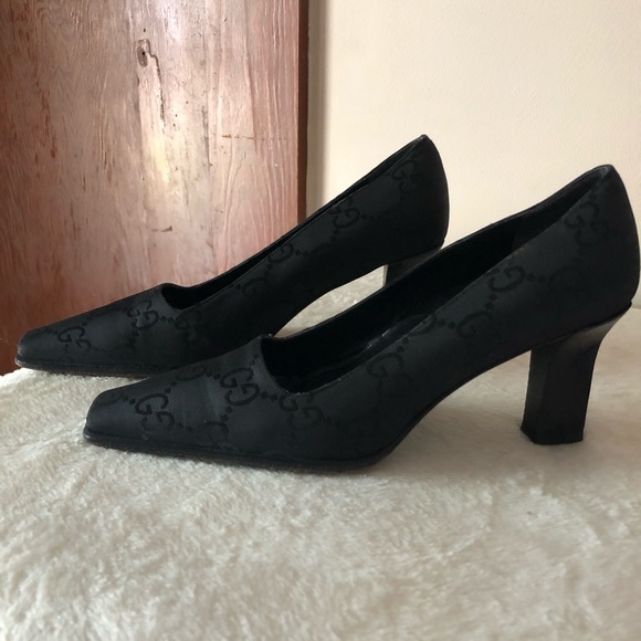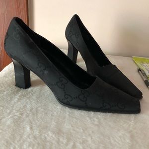 SOLD!!!! Gorgeous Gucci, 2 inch heels, black material, material is sort of like a mix between jacquard and satin. Shoes featuring the GG logo over entire shoe. Sizes 8B, however, run on the narrow side. I think 7 or 7.5 is best fit