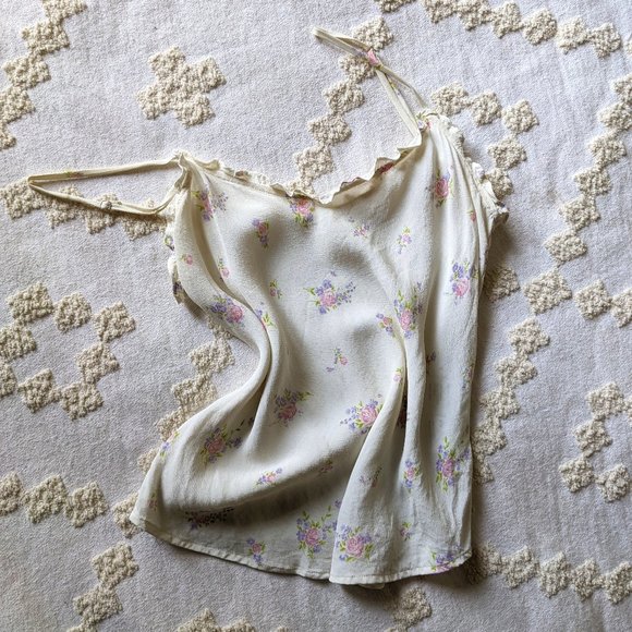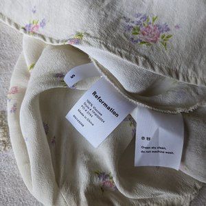 Purchased from Reformation in 2018. GUC. There is a faint grey mark under each arm that looks like the shadow of a crease, but otherwise no flaws. I'll post a photo later today. I also handwashed it to make sure there wasn't any yellowing.