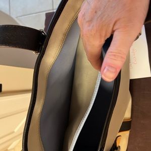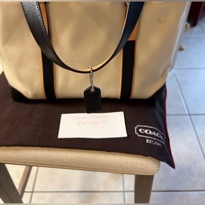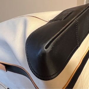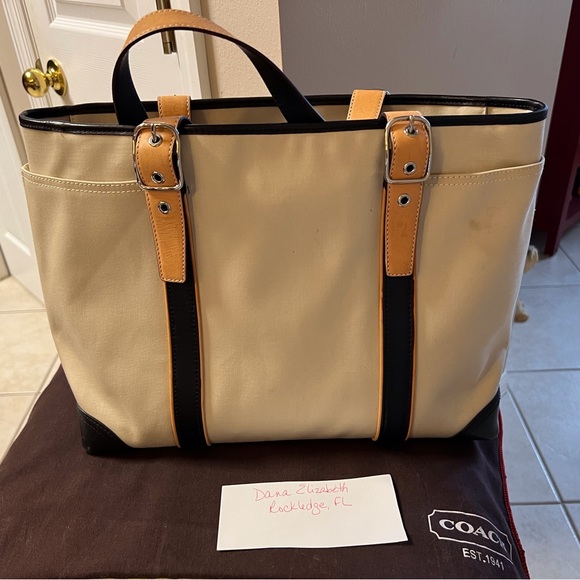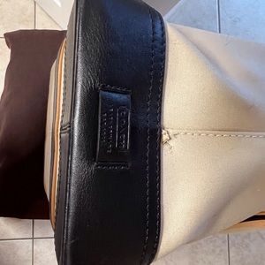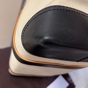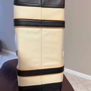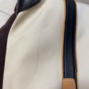 Authentic off-white tote with beige and black leather accents. Has outside pockets on each side and 2 large pockets inside. Does have a couple marks, as shown. Leather is all in tact but has some rubs on the corners. Seams are in tact. One tiny rip on the side by the leather. Shown in pic 5. Still has lots of life left. Zipper closure and runs smooth.