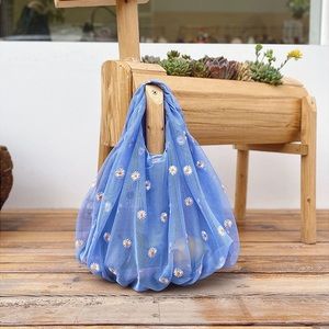 This mesh tote is made of lightweight cotton and features a super cute floral design. Perfect for spring/summer, cottagecore approved!