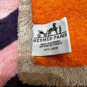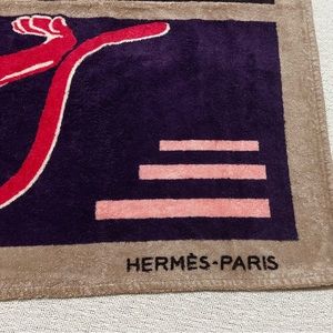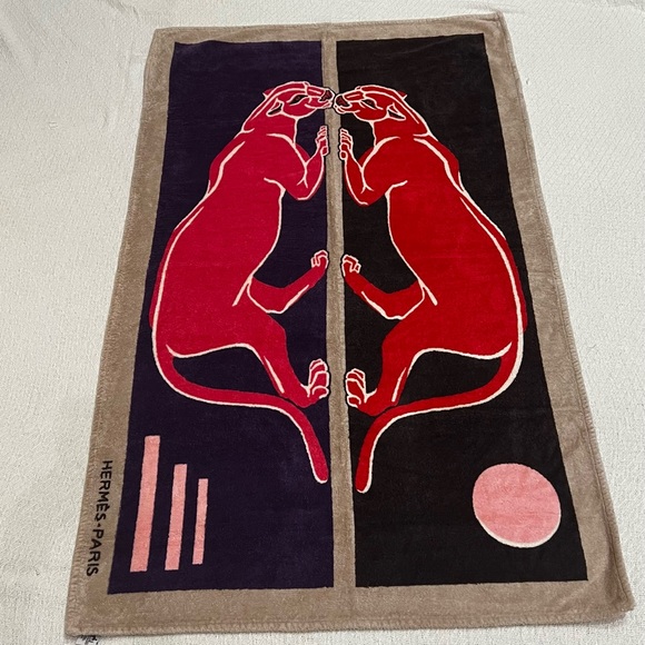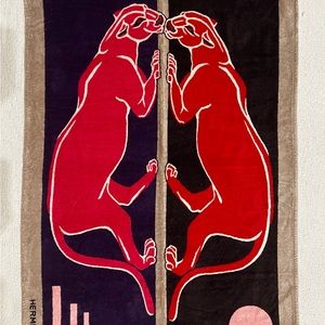 Authentic Hermes beach towel featuring kissing panthers(one hot pink and the other red). Absolutely gorgeous! Purchased from Hermes in 2019. Excellent condition and comes with box. Predominant colors are purple, red, pink, and tan with the Hermes orange back. This is an heirloom and statement piece. Had it on a boat we recently sold & only used a few times.