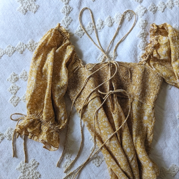 Previously owned by two other Poshers. The first damaged the string a little, it kind of looked like it got stuck in a bike chain maybe. I was able to get some of the dark staining out but a slight amount of it remains as you can see in my photo. It's a very light grey. There are also a couple areas on the string where the fabric is frayed, also shown in the photo. Other than this the dress seems to be in good used condition and you really can't see these imperfections when wearing.