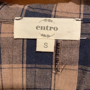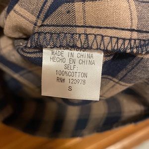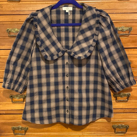 Size S, adorable short sleeve top with ruffle collar, puff sleeves and functional buttons Navy and beige checkered NWOT ✨offers welcome✨