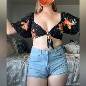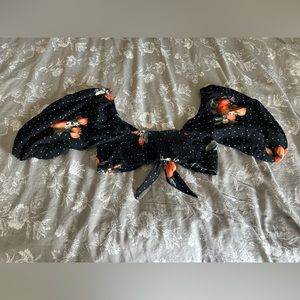 Ties in the front, very small would fit a more petite person well. Orange pattern.