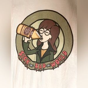 This is a RARE handmade shirt by an artist off of Etsy - one whom I do not remember their name [so sorry !] but features Daria with the “sick sad world” logo && she’s drinkin’ an OE 💚🍺 I absolutely love this shirt, but it’s time to make room for new. There is some pilling, && stains, && I’ve featured those in the pics above.