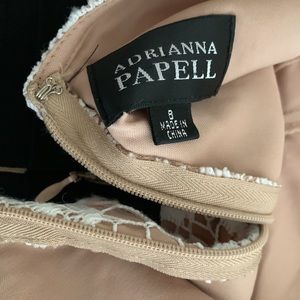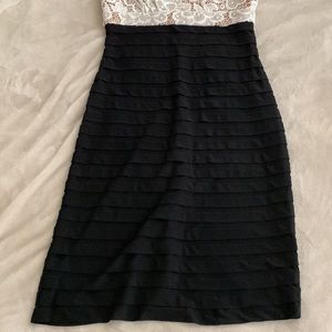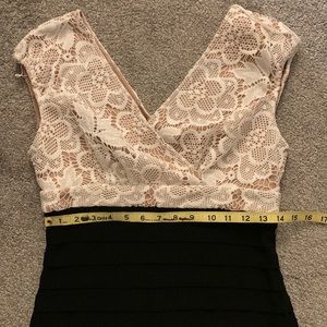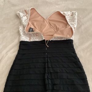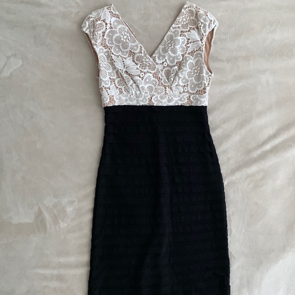 Elegant cocktail dress for any special occasion. Cream nude underlay crossover top with black bottom. Zipper back with hook and eye closure. NWOT.