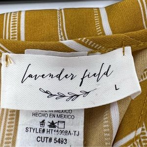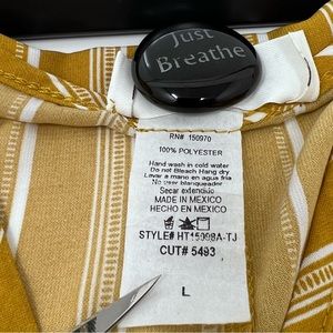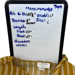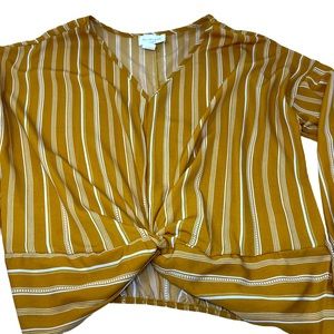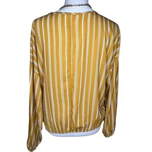 This gold/white striped blouson has a deep v-neck and lovely drape at the waist. Looks terrific with white skinny jeans!