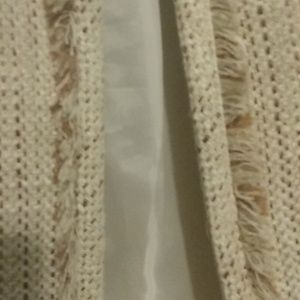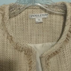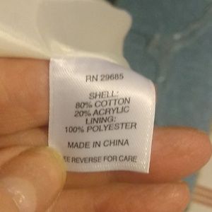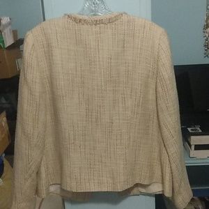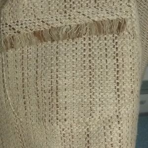 This jacket is a mint condition. It has the look and feel of linen (it's very soft). The collar front of jacket and pockets have this shredded look to them, which makes it kind of edgy. This is a great jacket for the office, church or just running around town doing errands in blue jeans and loafers.