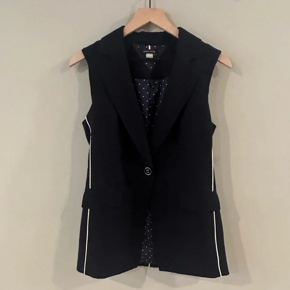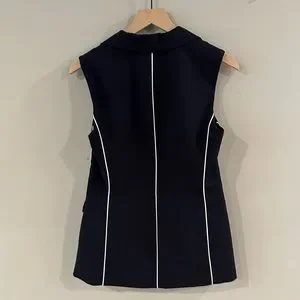 Navy blue fully lined sleeveless blazer vest. Functional pockets, white piping, and single button closure. Excellent used condition.