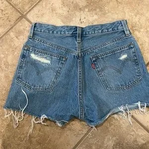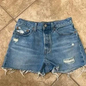 Levi's 501 denim shorts with button fly. High rise. Raw hem and some distressing. Perfect condition, no flaws. Fits 24"-26" waist