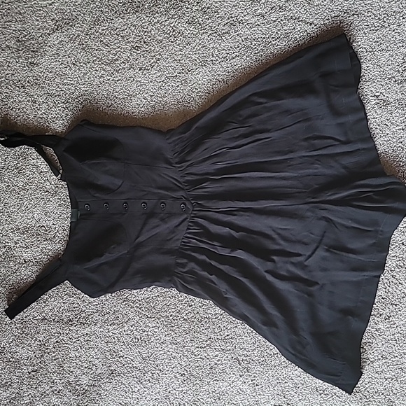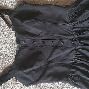 very saucy black romper with "corset" style top. buttons don't unbutton. wide straps- adjustable.