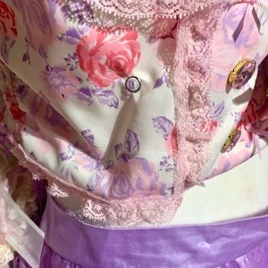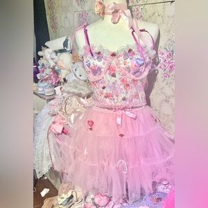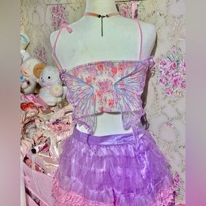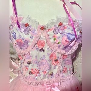 Hi, thanks for looking! Here’s a top I got from shein that I’ve given a nice makeover. The top was only tried on before upcycling. I’ve added a pair of purple and blue butterfly wings on the back. On the front there are purple butterflies inside the cups and a pink one above each, red rosettes adorn the lace at the top of blouse, two purple (slightly different shades) ribbons lay on the straps I’ve made from pink lace trim, and there is more pink trim through out. Inside of each cup is also a pink rosette, and purple heart appliqué; at the center are pink rhinestones and bows. There is an eyelet on there pictured. The material is thin.