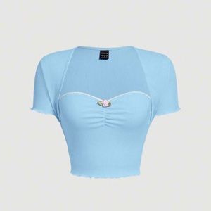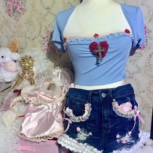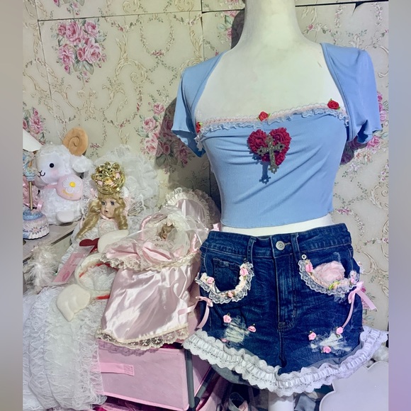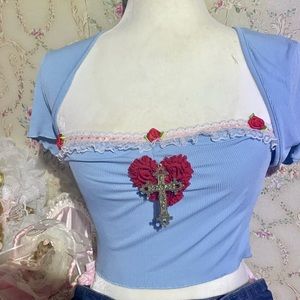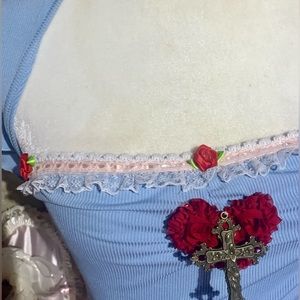 Hi, thanks for looking! Here I have this brand new crop top that I’ve adorned. I’ve added the peach lace trim, red rosettes, floral red heart, and large cross appliqué. One of a kind and beautiful ! Brand is shein. Material is stretchy