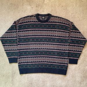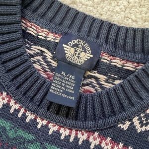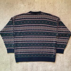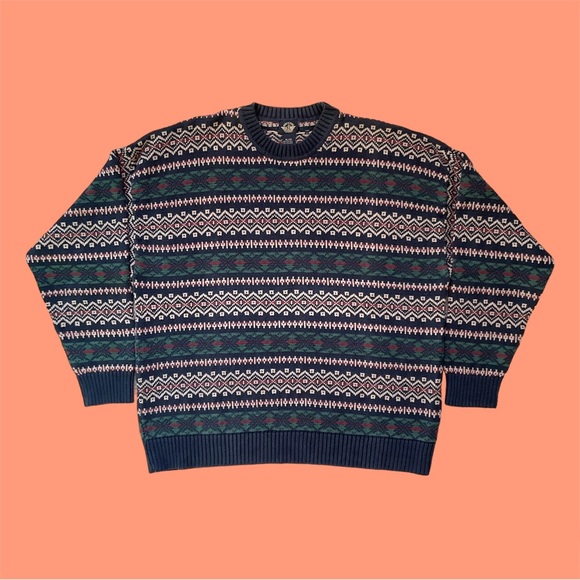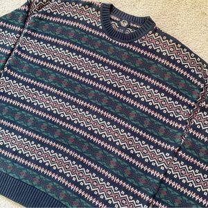 Vintage 80’s Dockers navy blue pullover sweater. Classic grandpa colorful but muted geometric pattern all over! Very heavyweight but somehow also not too thick.