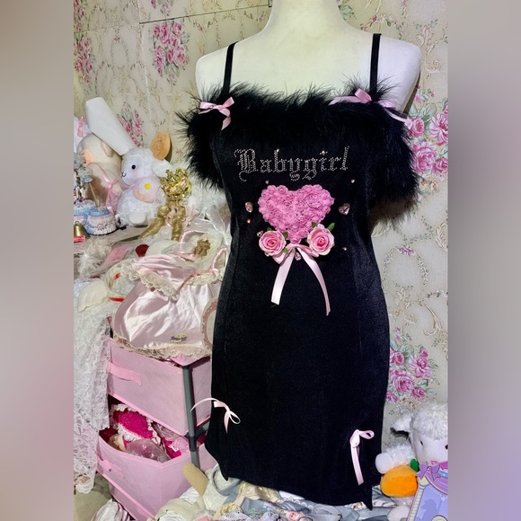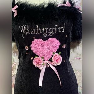 Hi! Thanks for viewing. This is in nwots condition, I bought her secondhand in never worn condition. This dress is lovely and romantic, embellished by me. I’ve hand sewn the heart rose lace appliqué, soft pink ribbon bows, pink rhinestones, and added the two removable rose head appliqués. The end result is this delicate feminine piece that be treasured for years and years. The brand is poster girl. The material of the dress is thick(velour).