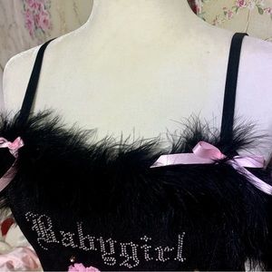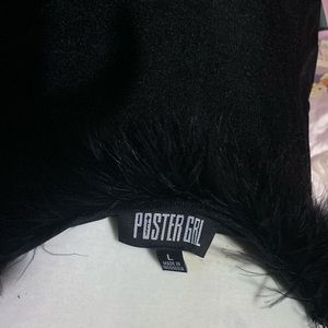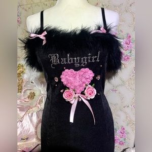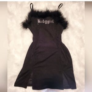 Poster Grl Free Smoke Babygirl Boa Mini Dress because you're what they mean when they say smokin'. This velour mini dress has "babygirl" bedazzled on the front, a side slit, and boa feather trim at the bust.