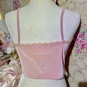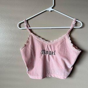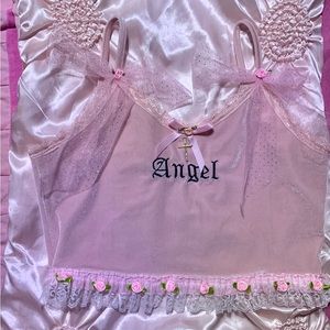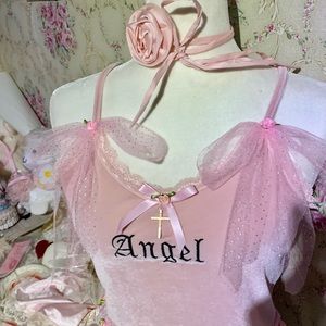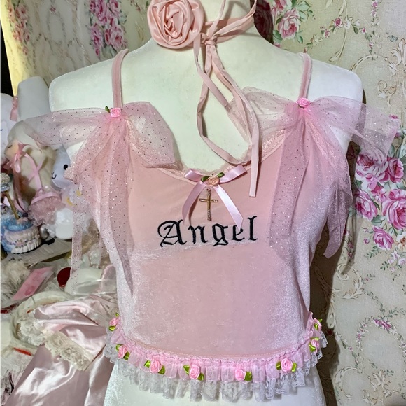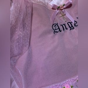 Hi, here is a shirt I bought secondhand in good condition. I’m not sure of the size as there are no tags, but it’s seems to a fit a s/m. I’ve added the rose lace trim at the bottom, tulle ribbon bows with a pink rosette, pink ribbon bow with a peach rosettes, and a cross appliqué. Very adorable. There was a rip in the seam that I’ve repaired.