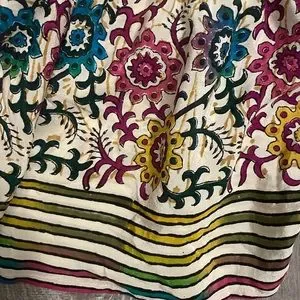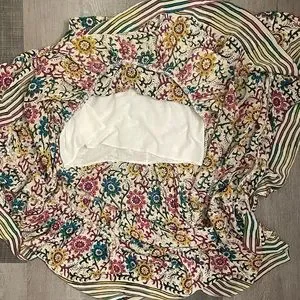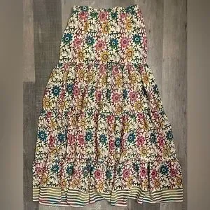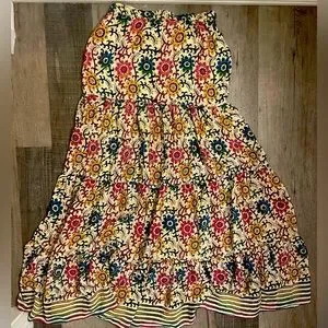This gorgeous piece by Tolani can be a maxi skirt or a strapless midi dress, depending on your preference. It is 100% silk with a 13” polyester lining, has an elastic waistband that stretches from 13” to 18” (laid flat) and is 41.5” long. It is labeled a size small, but could probably also fit a medium (see measurements above)