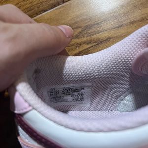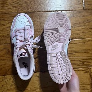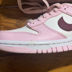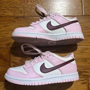 Lightly worn pink foam nike dunks. Bought brand new from StockX, just not my style anymore. Size 4Y which is equivalent to a women’s size 6. No box. Has a small yellow dot on the rubber part of shoe.