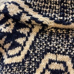 Heavy hand knit. Waist tie makes it adjustable, or can be worn completely open. Great condition. I have sweater shaved it and did light mending on a few spots.