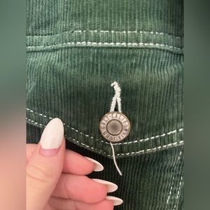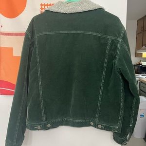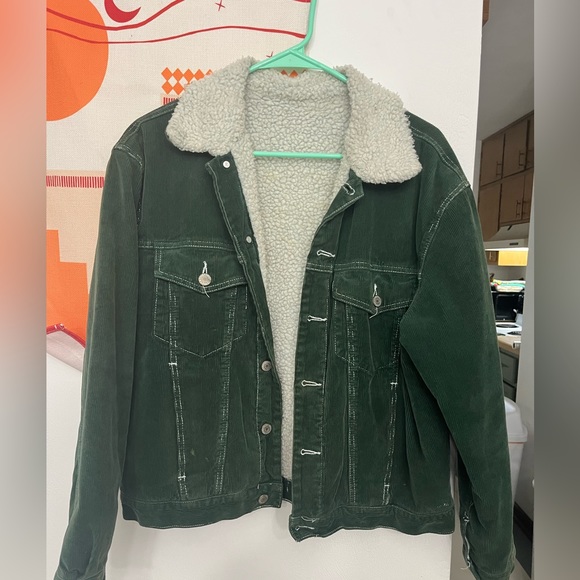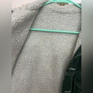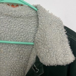 Brandy Melville / John Galt green corduroy jacket. Purchased at the brandy location in Rome. Most visible west and tear is on the Sherpa; there are some stains and pilling and it just generally looks a bit worn. Corduroy looks good though. No size but I’d equate this to an oversized small or a medium.