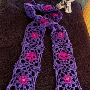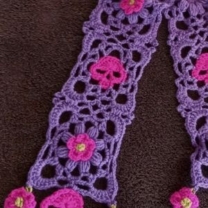 Lace,skulls and flowers oh my! Crochet and designed by me,super long and the prettiest thing you ever did see in a gorgeous lilac with hot pink skulls annnd flowers. It is just an amazing crochet piece to add to any pastel goth,lolita,cottagecore or faircore outfit...or any outfit for that matter...this scarf makes the outfit, haha. True though.