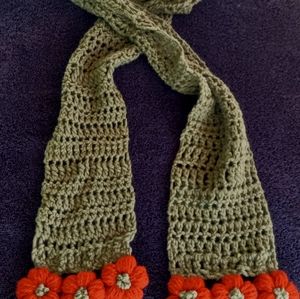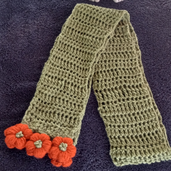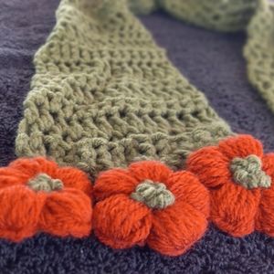 Extra long,openweave scarf,crochet by me, in od green with adorable contrasting pumpkin orange puff flowers to wrap you up like a warm hug while you frolic in the forest or stomp the city streets and look darn cute doing so.