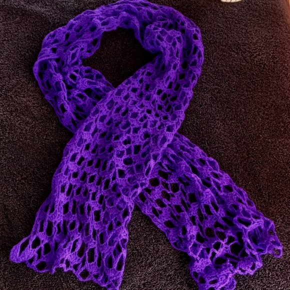 Lovely lacy crochet scarf in a gorgeous shade of indigo purple. It's an extremely lightweight and airy openweave lace that's perfect for any occasion.