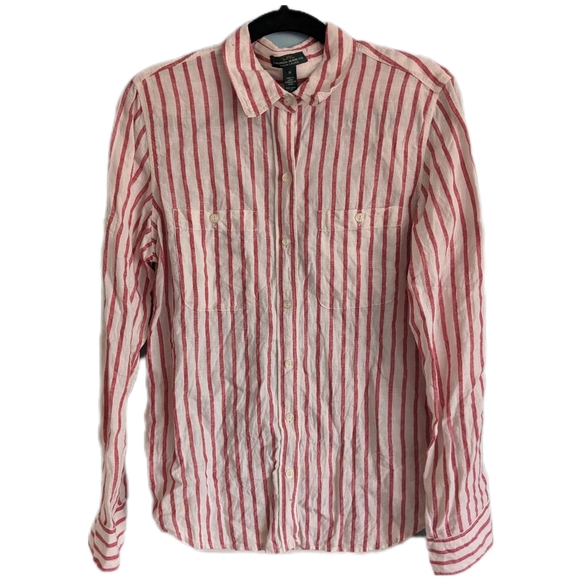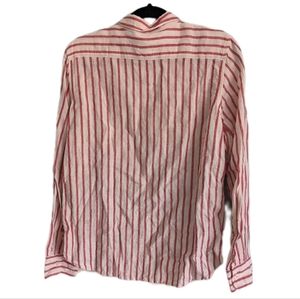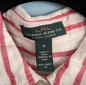 Red and white striped linen LRL Lauren Jeans co. Ralph Lauren button up blouse top in women's size medium.