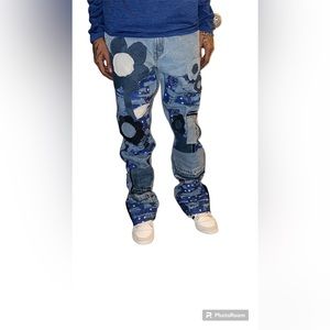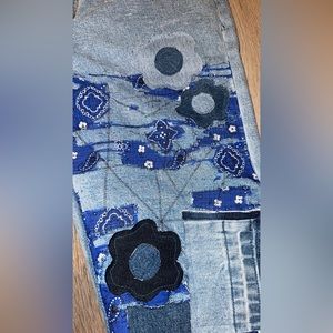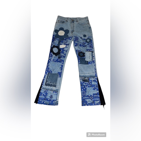Mens 1of1 custom flare patchwork jeans blue paisley bandana distressed with black zigzag stitches, hand cut flowers made from denim scraps, custom black flares. Size 32x32 brand new & will come with my own Jean label & hang tag