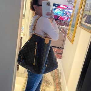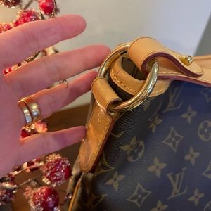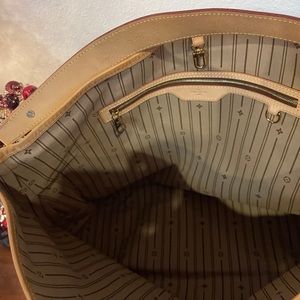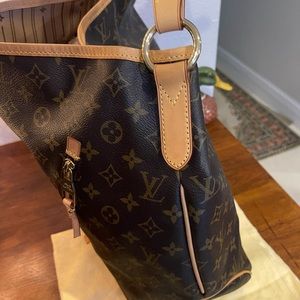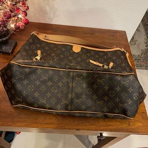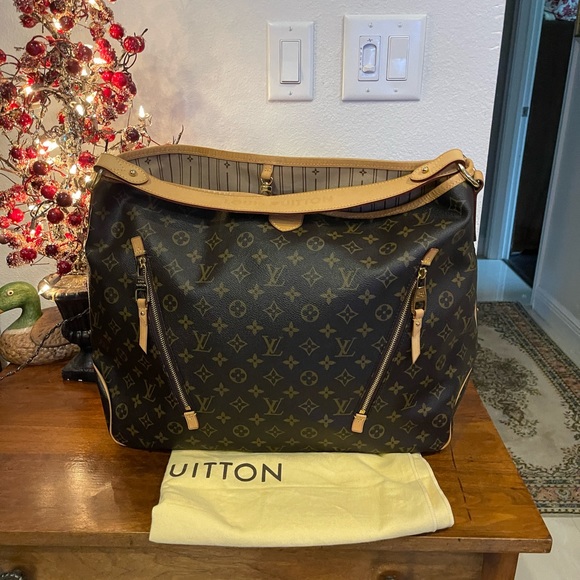 This is an authentic LOUIS VUITTON Monogram Delightful GM. This stylish tote is finely crafted of classic Louis Vuitton monogram coated canvas. This shoulder bag features a looping vachetta cowhide leather shoulder strap and trim, diagonal zipper pockets on the front, and polished brass hardware. The shoulder bag opens to a brown on beige striped fabric interior with a zippered pocket