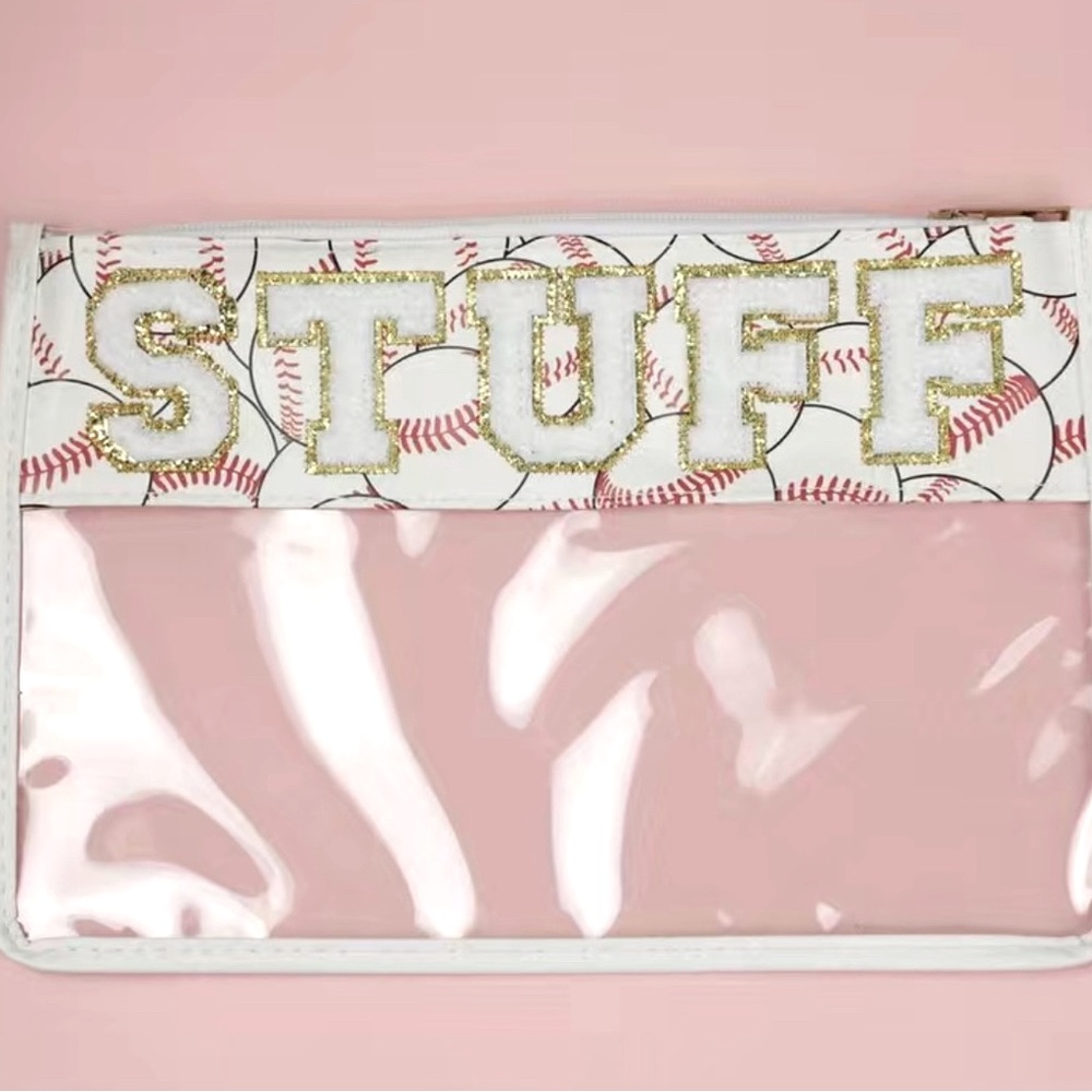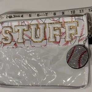 Baseball “STUFF” zipper pouch 12x8 with gold hardware. Bedazzled baseball keychain comes with it w/silver hardware. I have it without the keychain as well.