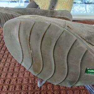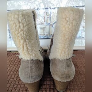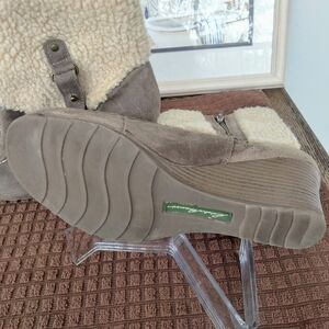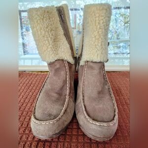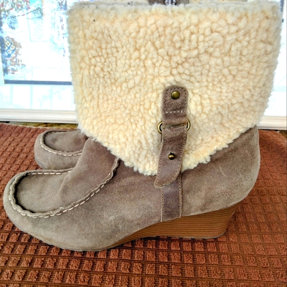 Eddie Bauer "Tara Chocolate" Suede Side Zip Wedge Boots. Size 9M. 2.5" Wedge. Faux Fur. Good Pre-owned Condition.