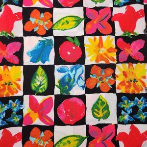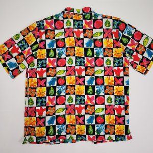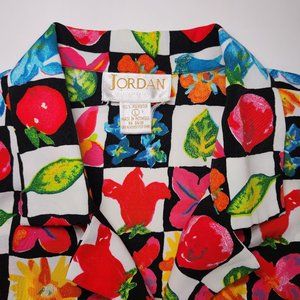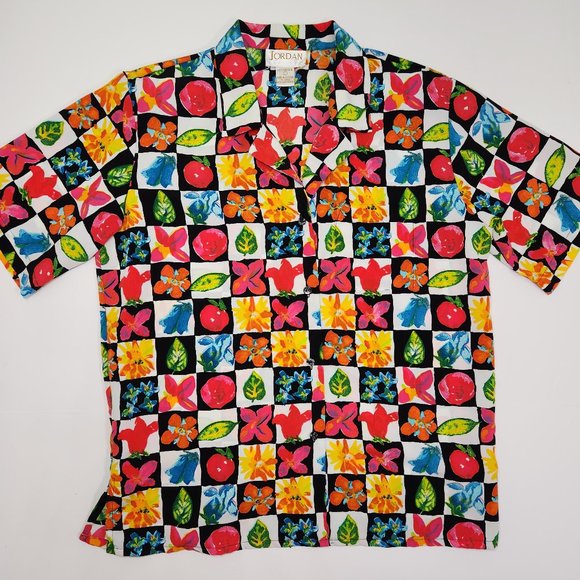 ⚡ Vintage garden grandma blouse. 90's Jordan crazy print loud cottagecore summer button up shirt. Checkered print top with squares of leaves, flowers, and vegetables in an eye catching retro art style. Light shoulder pads. Tagged women's large. ⚡