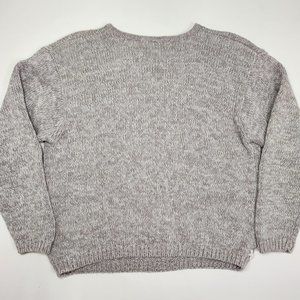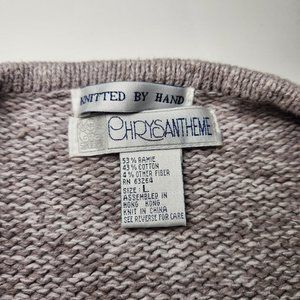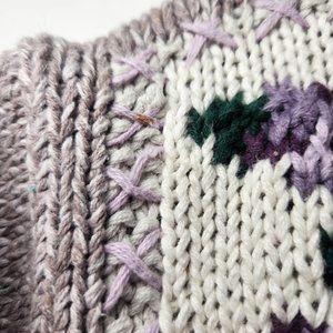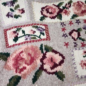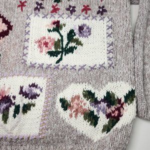 ⚡ Vintage cottagecore sweater. 90's Chrysantheme floral grandma sweater with roses, hearts, and stitched crosshatches. Sweet patchwork theme. Light shoulder pads. Cozy thick chunky knit crewneck. Gray, purple, and pinks. FLAWS: one stain on right shoulder (pictured). Tagged women's large. ⚡