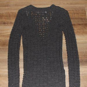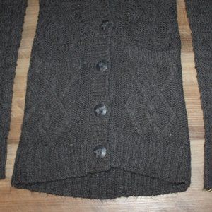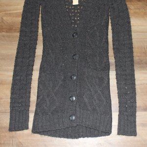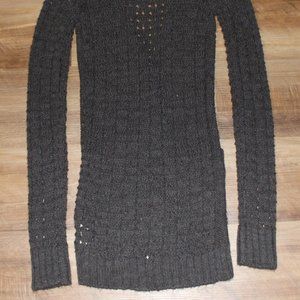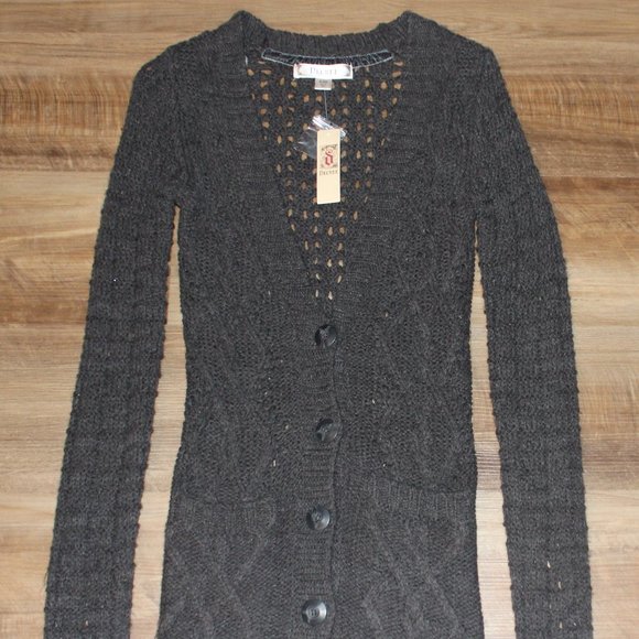 NEW with TAGS size SMALL sweater! Pretty dark gray mixed knit tunic length cardigan sweater with low v-neckline and square pockets at front. Chunky cable and chain knit, semi-sheer, will probably want to layer another top underneath for full coverage. This one is SUPER SOFT & MEDIUM WEIGHT with STRETCH! Made of 95%