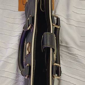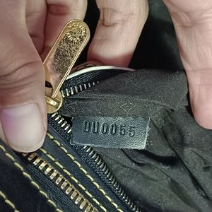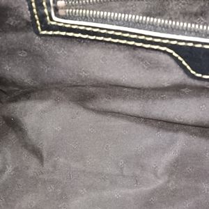 The exterior leather is clean and beautiful throughout. The leather exterior has light creasing throughout and creasing to the handles. The hardware is bright but have visible surface scratches. The interior lining shows wear and the zipper pull for the pocket is missing. The bag has a slightly musty odor. Overall the bag is in good condition.