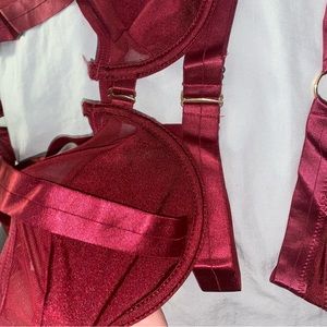 biregendy set comes with everything pictures. bra is adjustable with front closure panties are adjustable to for a custom fit. buttery soft looks like it had a metallic sheen to it i. person all pieces are a small. only took out of packaging for photos reminds me of honey birdette. listed in other platform get why it’s available