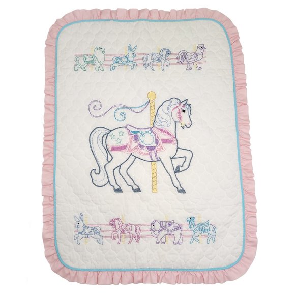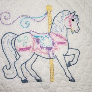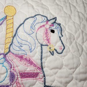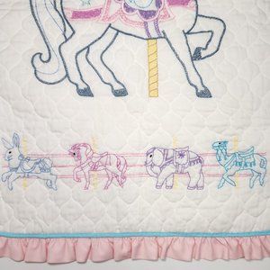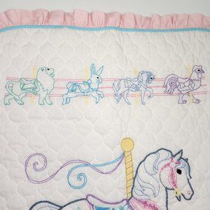 ⚡ Vintage 80's pastel circus themed embroidered carousel crib comforter. Handmade merry go round themed baby blanket with embroidered carousel animals like a horse, bunny rabbit, lion, and elephant. Can be used as a play mat or wall hanging. Has ruffled trim. Measures 40" x 29". ⚡