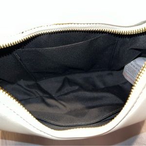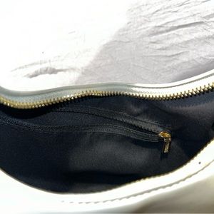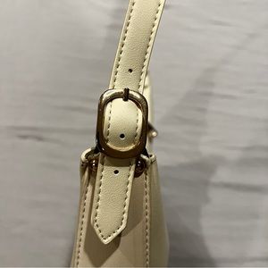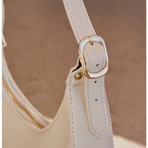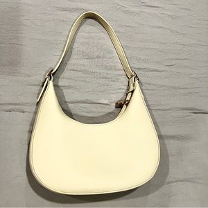 Amp up your everyday look with this chic shoulder bag. Featuring a cream hue material with a crescent shape design and mixed chain strap detail.