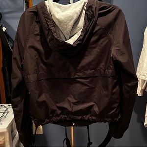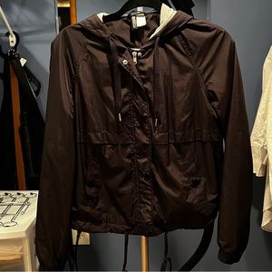 Short jacket in woven fabric with a jersey-lined, drawstring hood. Zip at front with wind flap and snap fasteners. Raglan sleeves with elasticized cuffs, side pockets with snap fastener, and a drawstring at hem. Jersey lining.