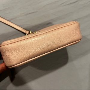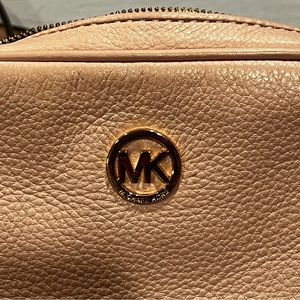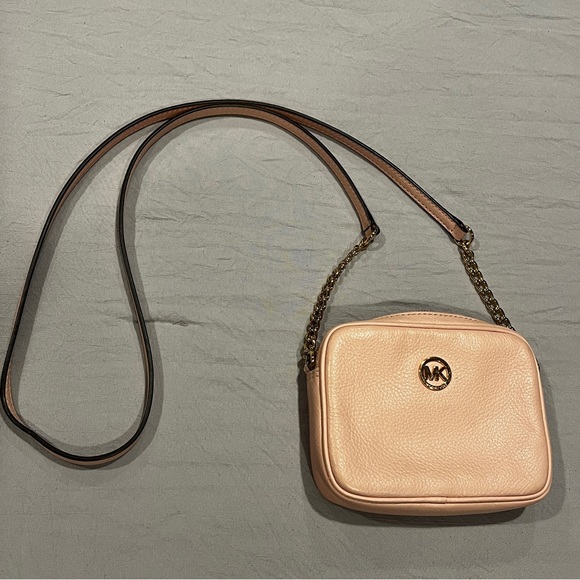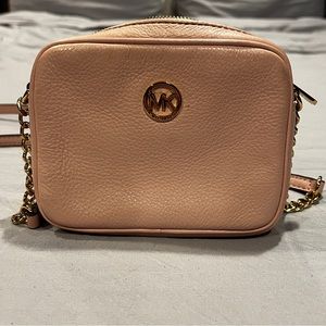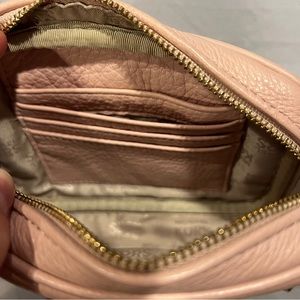 Thanks to a streamlined design, this leather crossbody from Michael Kors is easy and effortless. Soft pink color, card holder plus additional pocket on inside, and gold hardware with gold chain design.