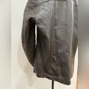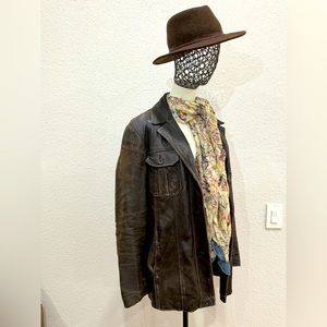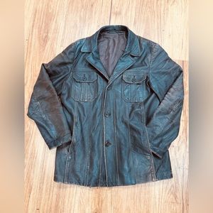 Vintage 1970’s men’s St Michael leather jacket in dark brown that can be rocked by any sex. (I'm size 14/XL in most women's clothing and this jacket fits me nicely). Wide notched lapels make a statement from the era. 3 button front closure and interior collar loop for easy hook hanging. Four front pockets in perfect condition, 2 with buttons. 2 interior pockets. Exterior shows signs of wear giving this Indiana Jones jacket an antique distressed look. This jacket is legit fire, made with luxury craftsmanship that you can feel when you slip into it.