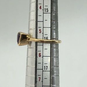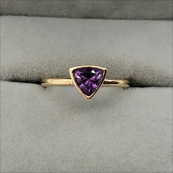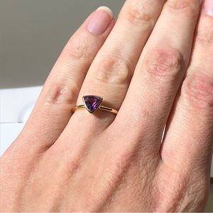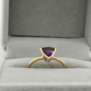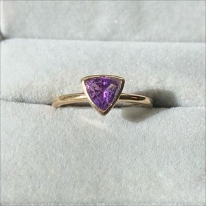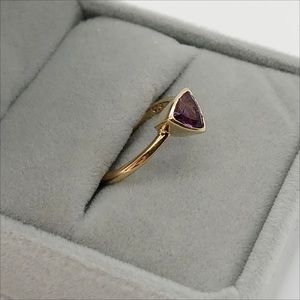 14k 14kt yellow gold ring with a raised triangle set with a glowing amethyst. This ring is perfect for stacking, or it looks wonderfully elegant worn alone.