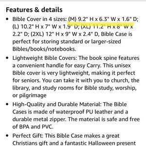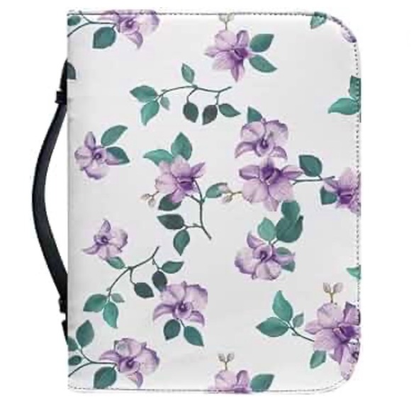 Size medium (measurements are highlighted in the picture above) cute white and purple floral Bible case. Brand new, I just purchased this but unfortunately it was a little to small for my Bible! Never been used