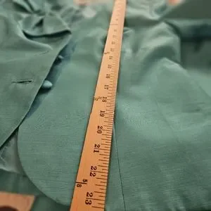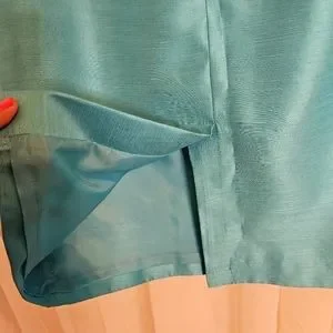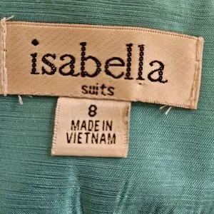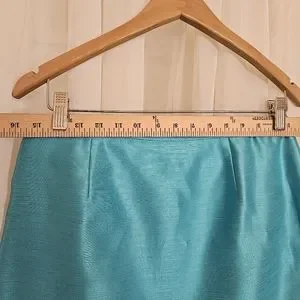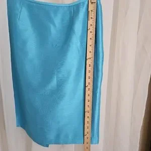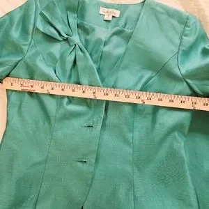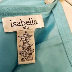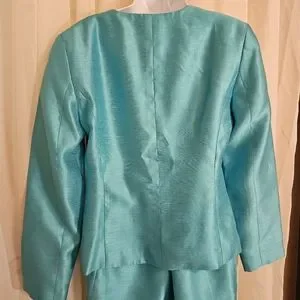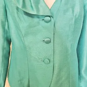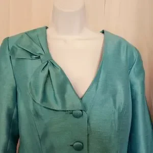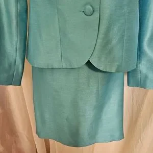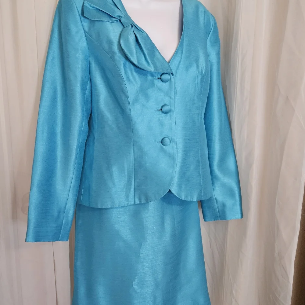 Elevate your wardrobe with this stunning Isabella 2 piece suit in a beautiful turquoise color. The jacket features a stylish bow on the side lapel and has a single-breasted cut with a V-neck lapel style. It also has a three-button front button style with no buttons on the sleeves. The accompanying skirt has a classic fit and is lined with a zipper at the back.