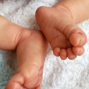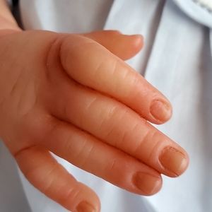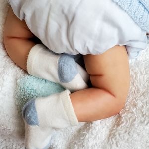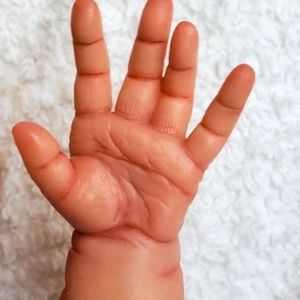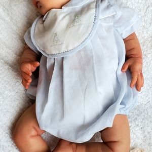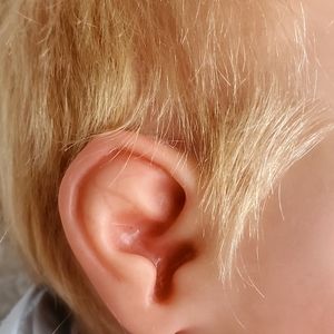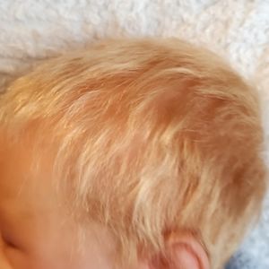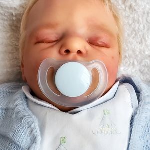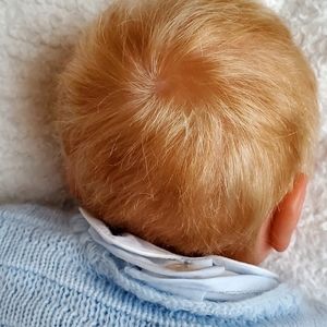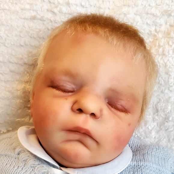 This sweet baby looks like he's sound asleep enjoying some rest as babies do. He has beautiful rooted blonde hair that is soft to the touch and easy to style.